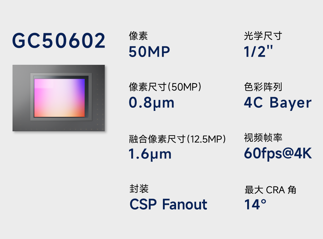 GC50602 采用 1/2" 光学尺寸与 0.8µm 像素规格,既可全分辨率输出 5000 万像素图像,也可通过像素合并实现 1.6µm 等效大像素成像。