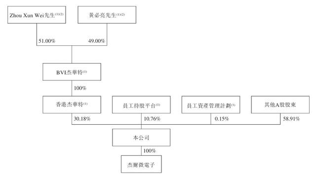 在股权结构方面,截至最后实际可行日期,ZhouXunWei、黄必亮、BVI杰华特、香港杰华特、安吉杰创、杰沃合伙、杰特合伙、杰微合伙、杰瓦合伙、杰程合伙及杰湾合伙将共同拥有并控制182,933,784股A股股份,占公司已发行股份总数约40.94%,为公司控股股东。